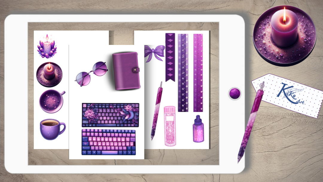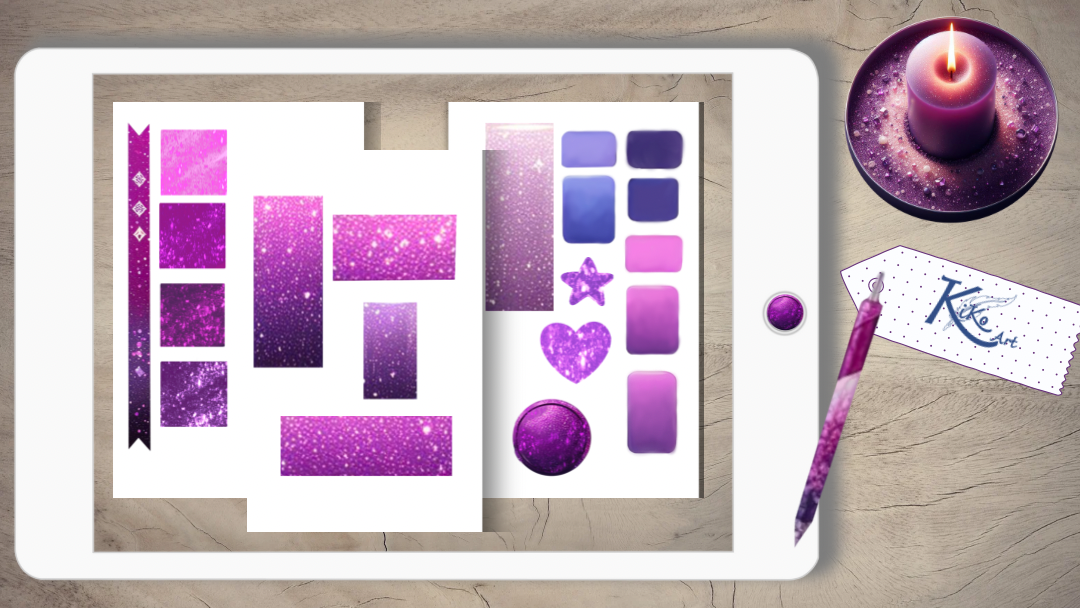 Füge deinen digitalen Projekten einen Hauch von Glanz und Eleganz hinzu mit unserem digitalen Kristall Sticker Set! Handgefertigte Kristalle, glitzerndes Papier, Kerzen und mehr in verschiedenen lila Nuancen. Verleihe deinen Planern, Kalendern und Notizseiten einen funkelnden Touch!