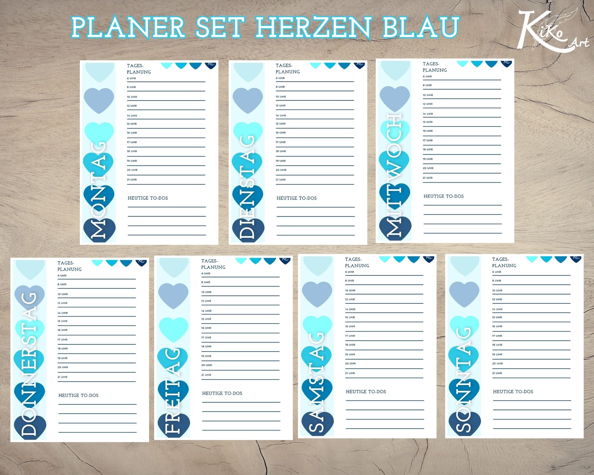 Willkommen in der herzlichen Welt des Planens! Mit meinem handgefertigten digitalen Planer Set „Herzen Blau“ bringe ich die beruhigenden Blautöne und herzigen Motive in Deine Planer, Kalender und Bullet Journals.